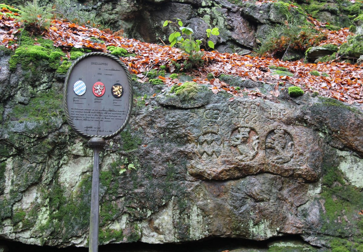 Přímo na státní hranici, na místě zvaném Drei-Wappen, najdete původně barevné tři historické erby vytesané do skály. Erby kurfiřtství bavorského (CB), Království českého (KB) a vévodství falckého (HP) spolu s letopočtem 1766 připomínají historický okamžik, kdy byla v roce po letitých sporech podepsána dohoda o průběhu hranice mezi uvedenými zeměmi. S výjimkou necelých osmi let, kdy ji posunula Mnichovská dohoda, se hranice od 18. století nezměnila. Tři znaky tak symbolizují trvalost a význam historických dohod pro budoucí generace a připomínají, jak důležité je udržování míru a porozumění mezi sousedy.